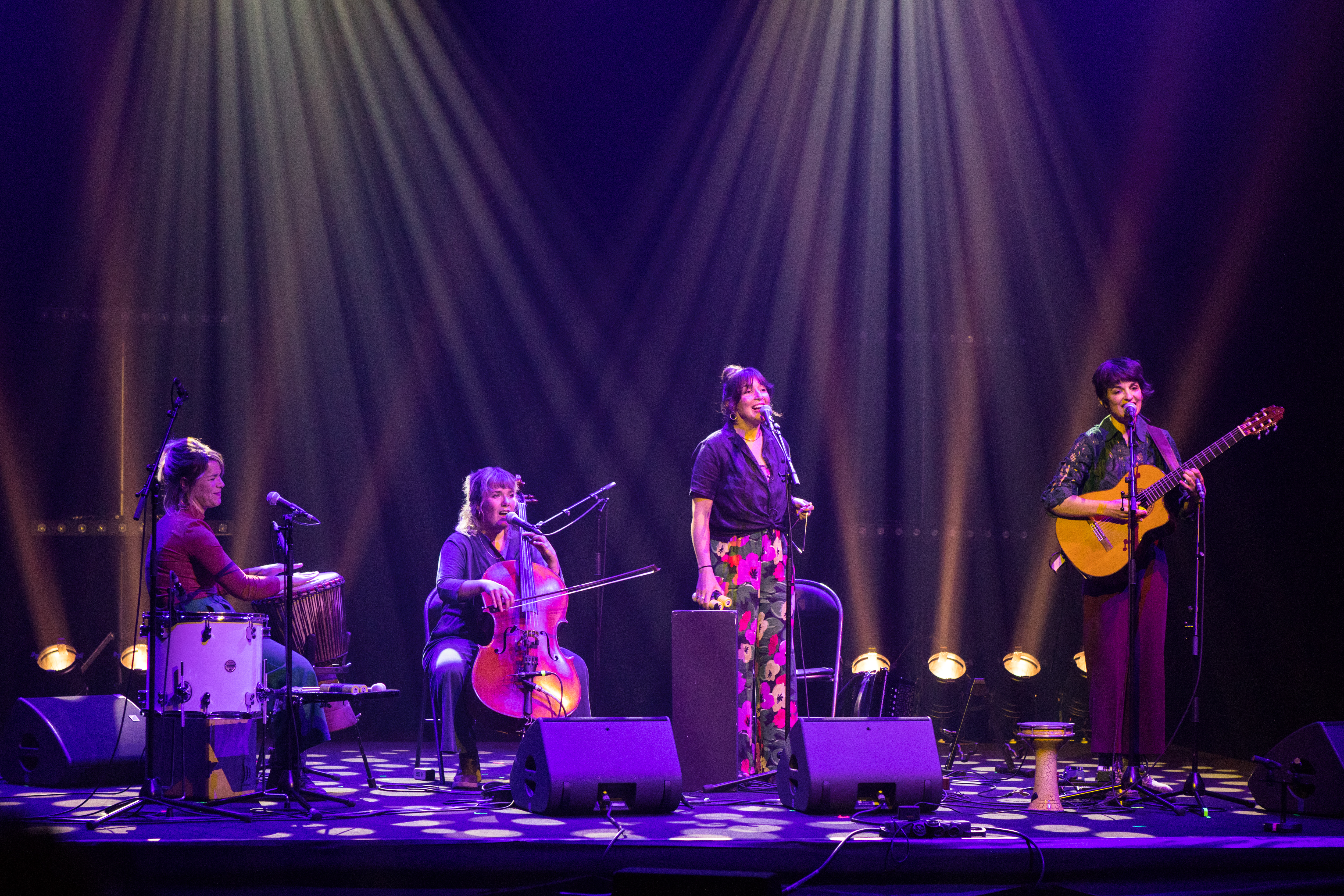 Les quatre chanteuses aux timbres clairs et aux tempéraments vifs s’accompagnent à l’accordéon, au ukulélé, au violoncelle, à la guitare et aux percussions pour déployer une musique hybride, à la fois traditionnelle et pop. On est embarqué par ces sonorités qui semblent si familières à nos oreilles et par ces rythmes à la joie communicative et puissante.